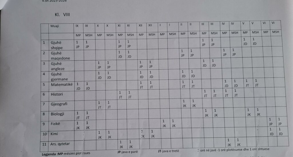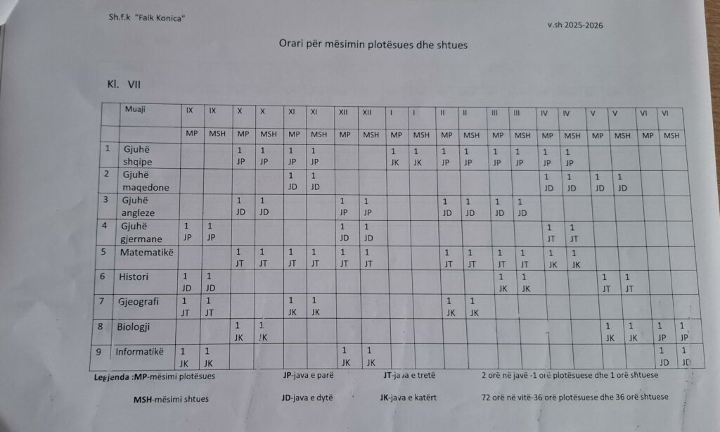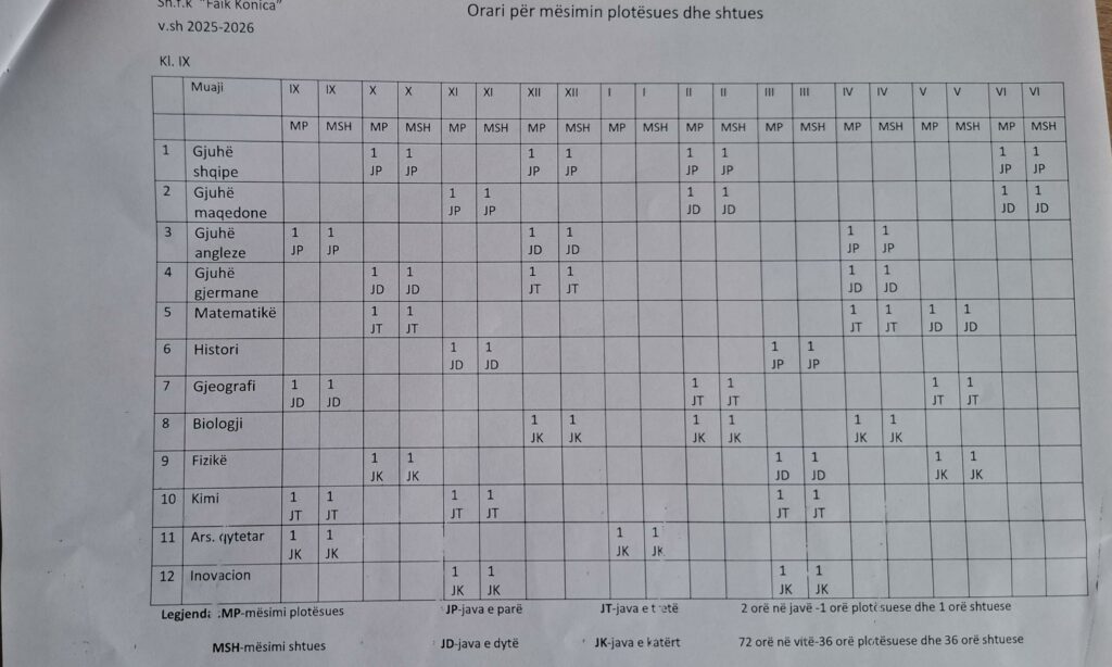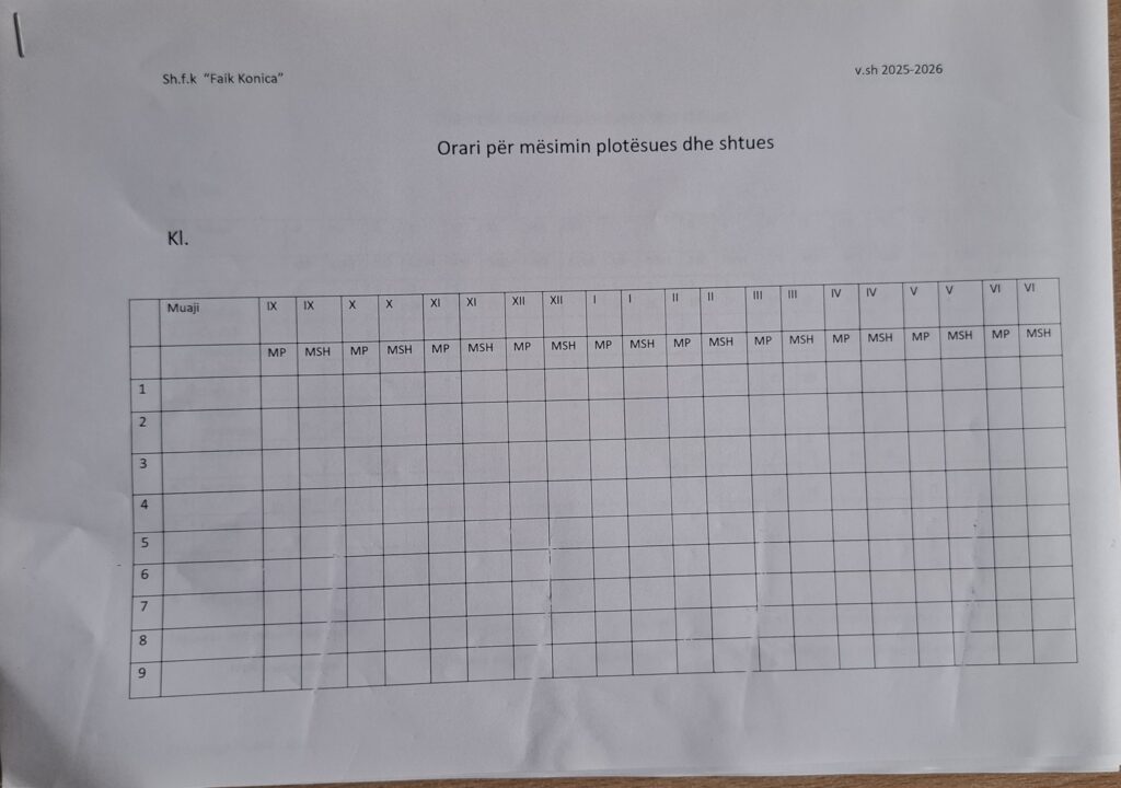 Orari për mësimin plotësues dhe mësimin shtues gjatë vitit shkollor 2025/2026